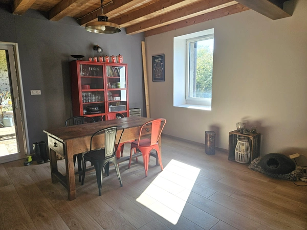 Votre conseillère Noovimo Claire POUZET 06 71 93 53 79 vous propose : En exclusivité, un cadre paisible, à l'abri des regards, dans un environnement bucolique ! Cette bâtisse en pierre, typique des anciens corps de ferme, a été soigneusement rénovée pour offrir confort, caractère et potentiel d'évolution. Actuellement 108 m2 habitables, elle se compose au rez-de-chaussée d'une belle pièce de vie lumineuse avec cuisine aménagée, d'un cellier, d'un wc et d'un local technique. À l'étage, l'espace nuit comprend une chambre avec son dressing, des zones de dégagements modulables laissant libre cours à vos projets (création d'un bureau ou chambre supplémentaire...). Un poêle canadien trône au centre de la maison et assure une chaleur douce et enveloppante dans toute l'habitation. À l'extérieur, vous serez séduit par le grand jardin, véritable écrin de verdure, ainsi que par une grange ouverte aux volumes généreux : stockage sans limite ou opportunité d'agrandissement, à vous d'imaginer la suite ! Située à quelques minutes du bourg de Teillé, cette maison est l'équilibre parfait entre sérénité rurale et proximité des commodités.